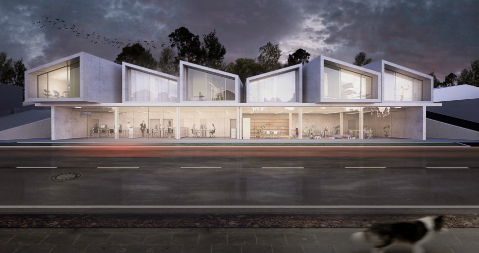 2층 건물은 윗층에 주택 유닛을 포함할 것이고 1층에는 여러가지로 사용 가능한 공간을 포함할 것입니다.