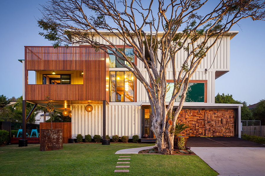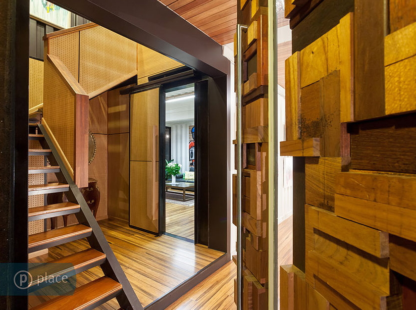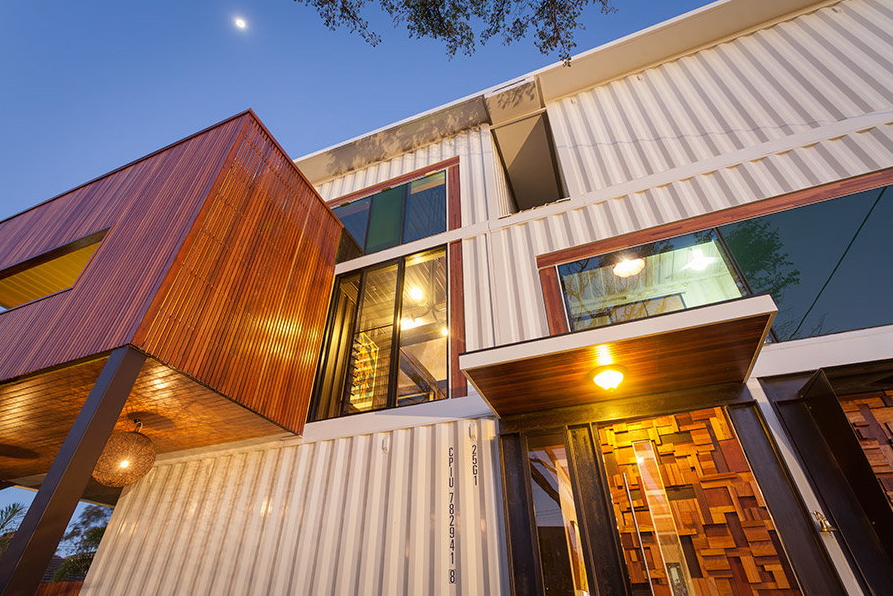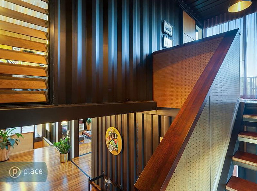 앞쪽 입구는 추가적인 목재 디테일 뿐만 아니라 컨테이너의 질감으로 만들어진 시각적인 흥미를 유발합니다.