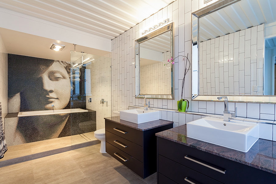 수영장에 인접한 가족방은 건물과 외부에 예술성이 즉각적으로 연결되게하는 큰 그래피티 캔버스가 있습니다. 이는 외부에 사용한 색감과 유사합니다.