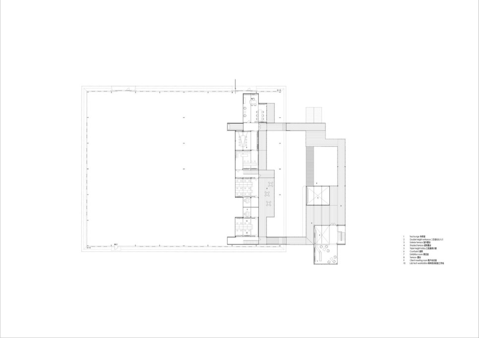 3층높이의 수직공간은 3면으로 열립니다. 안뜰에서 테라스는 아래층으로 지붕을 만들고 중국 안뜰 유형을 인용하는 반면 사무실 부분은 슬라브 및 기둥을
